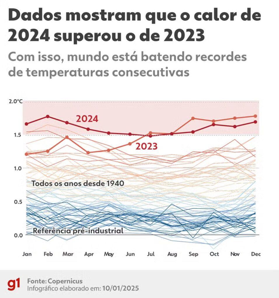 🌡️O ano de 2024 foi o mais quente da história e o primeiro a ultrapassar a marca de 1,5°C de aumento na temperatura média global em relação aos níveis pré-industriais.